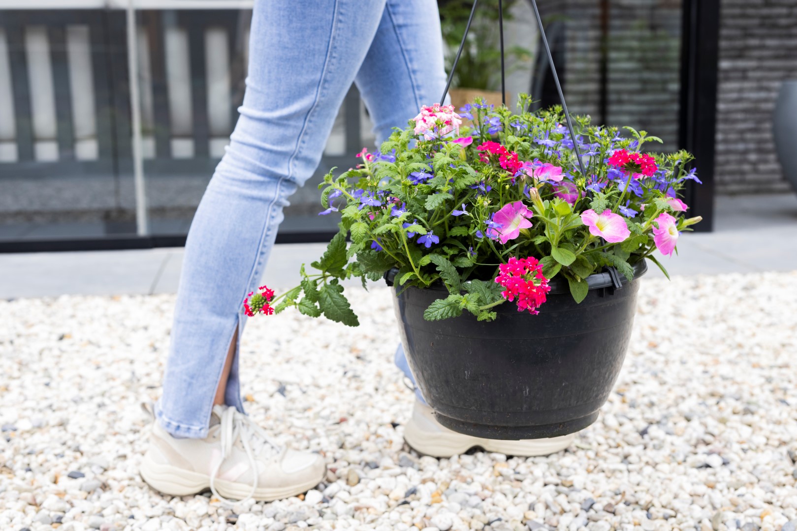 When hanging your Hanging Basket, choose a sheltered spot so that it doesn’t get battered by the wind. A position in sunlight is no problem – the plants actually like it!